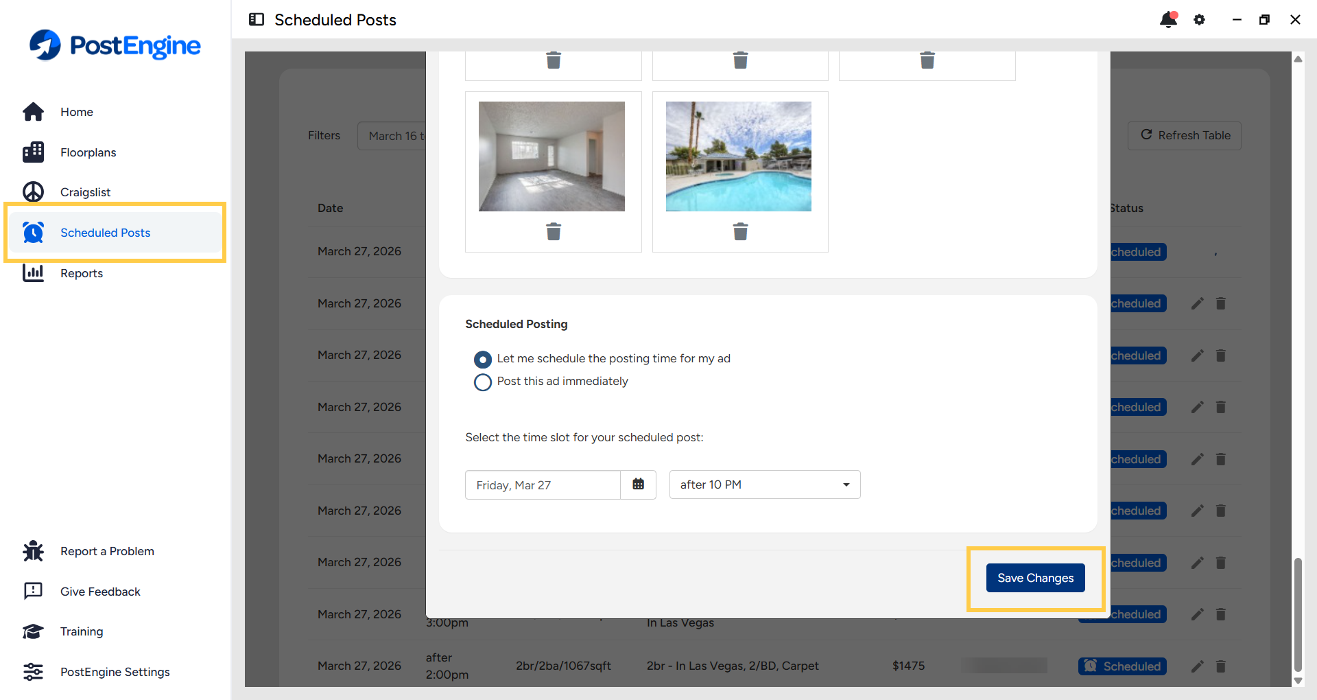 You can make changes to or delete ads that are live on Craigslist from the PostEngine Scheduled Posts queue.