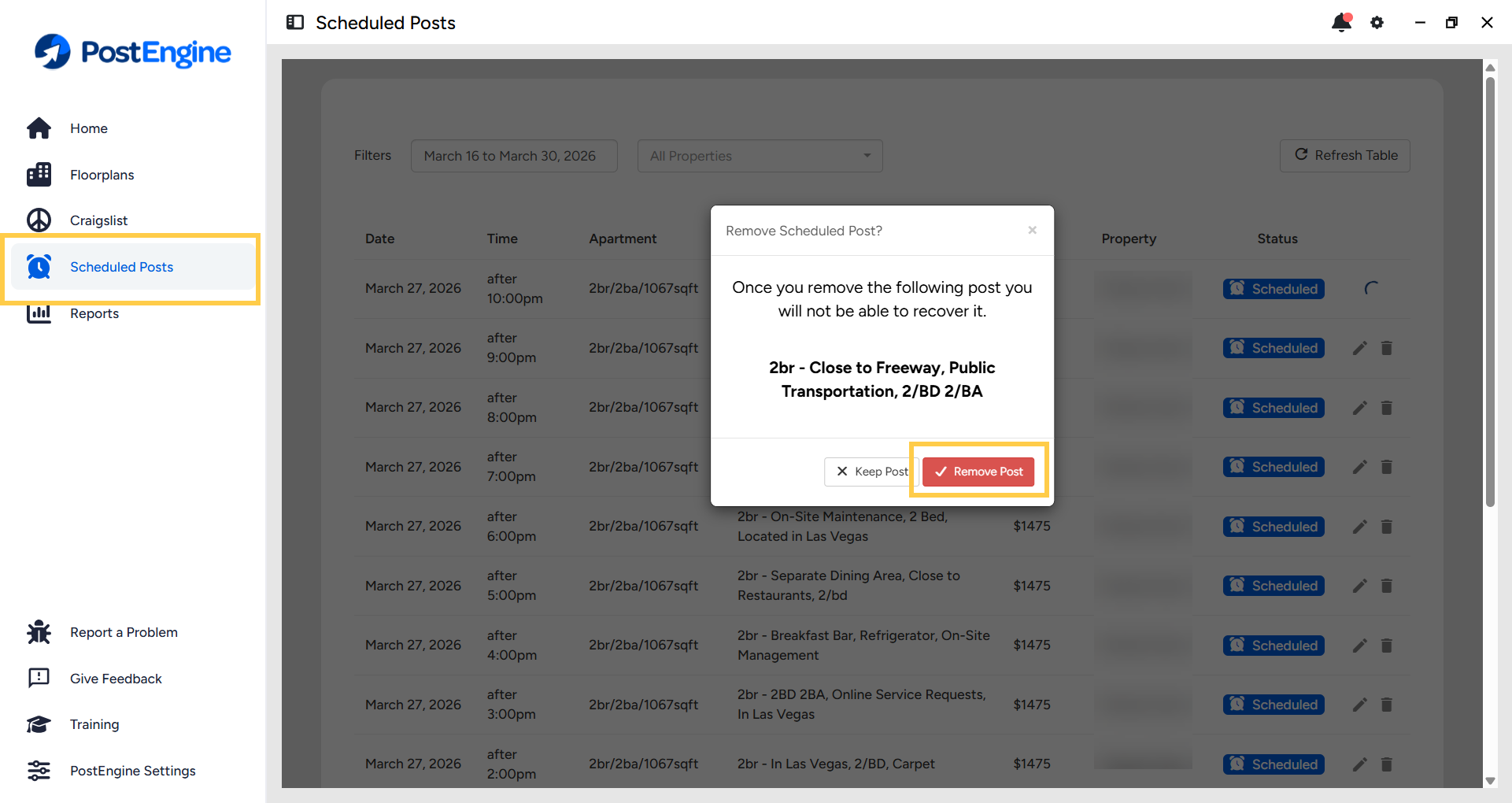To delete the post, click the trash icon, then click Remove Post to confirm.