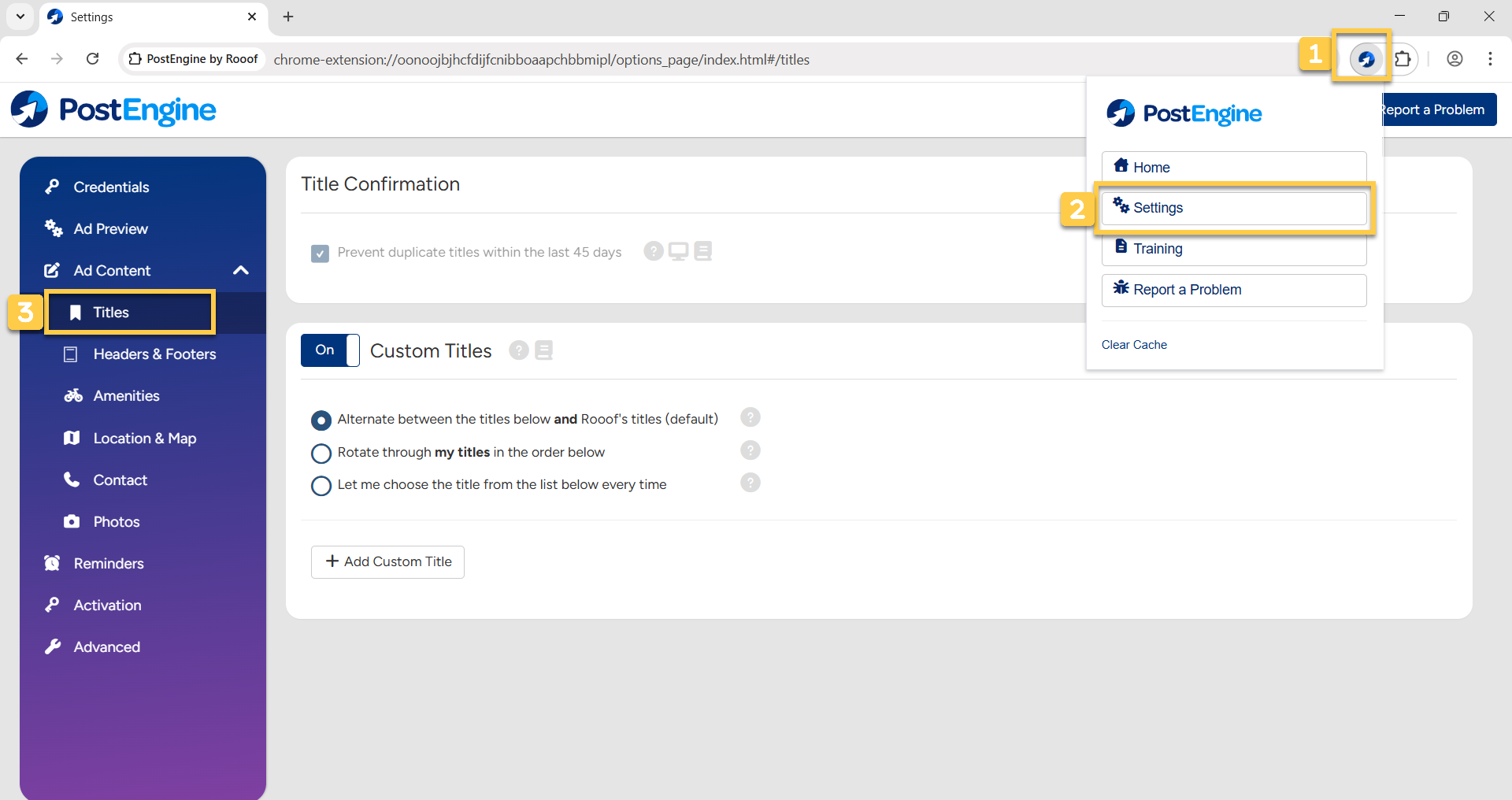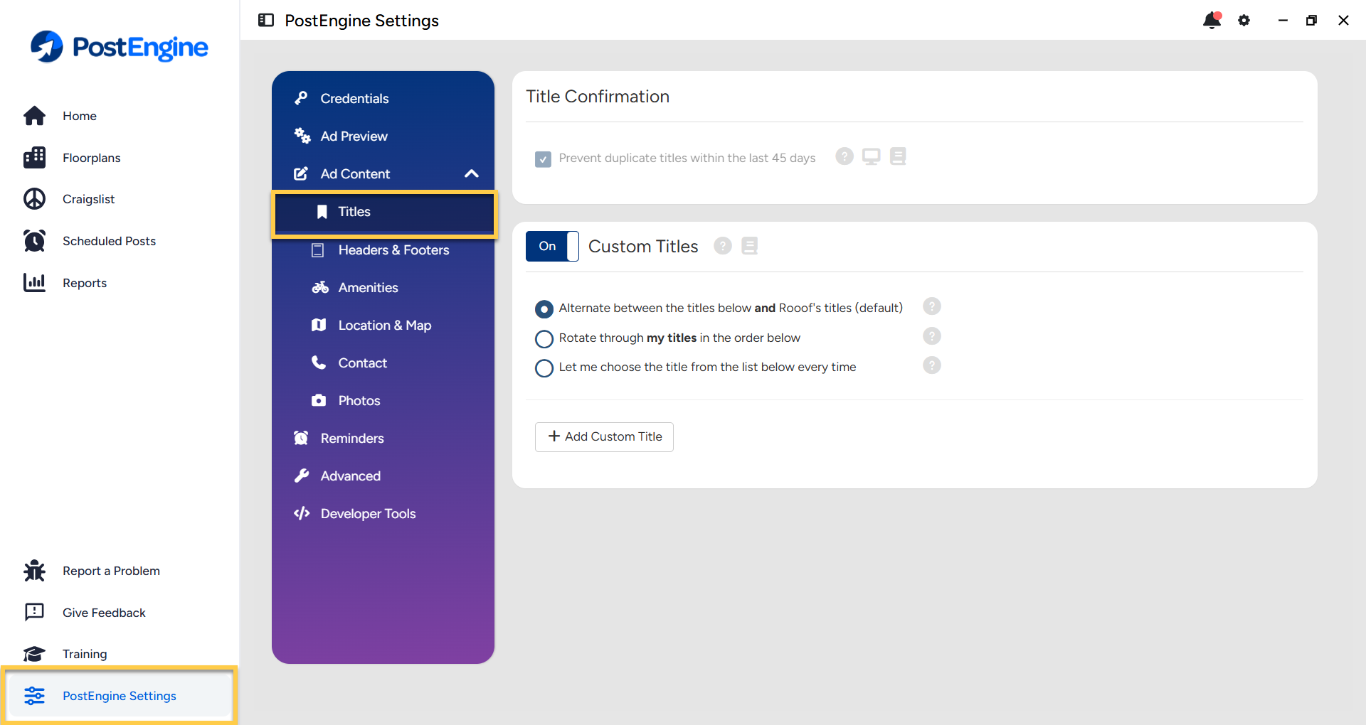 The Titles section can be found in your PostEngine settings. To access your settings: