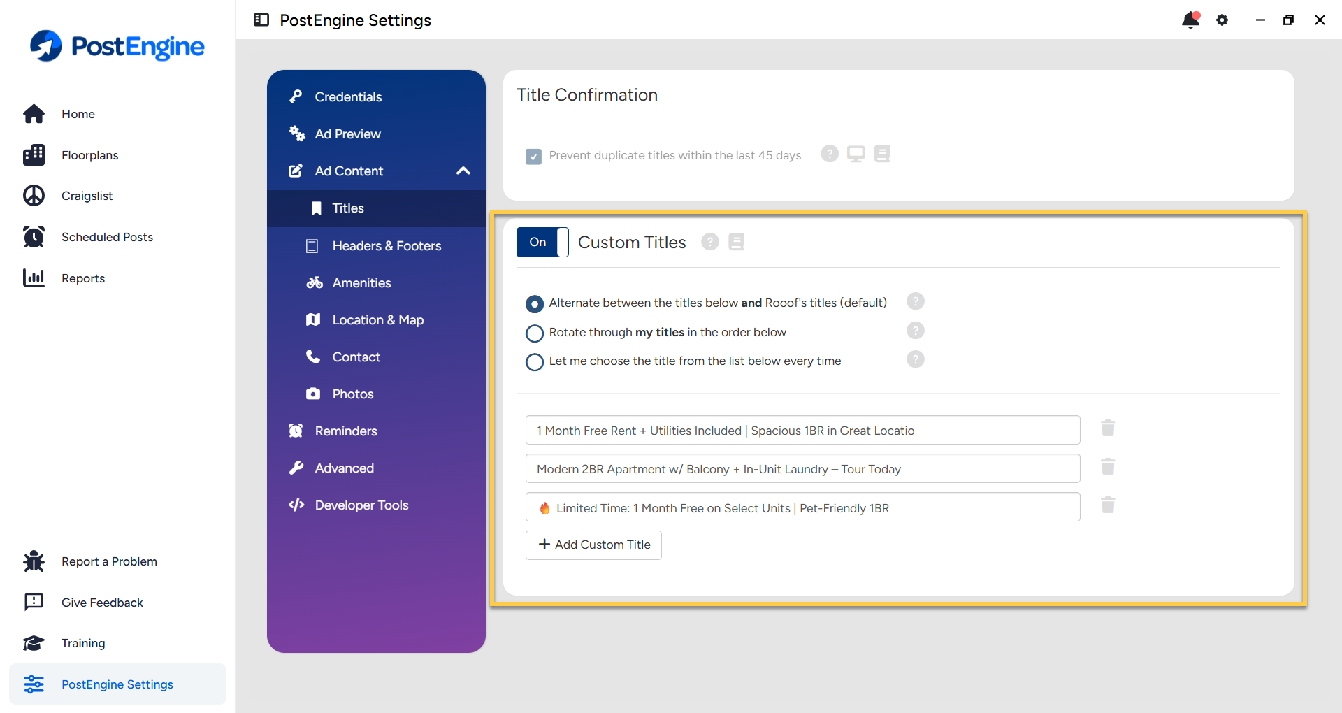 The Titles section of your PostEngine settings page allows you to store custom titles to be used in your Craigslist ads. By default, PostEngine automatically generates randomized titles using bed/bath count, amenity, and location information from the unit/floor plan you are posting for. You can choose to add pre-written custom titles if you prefer to use your own.